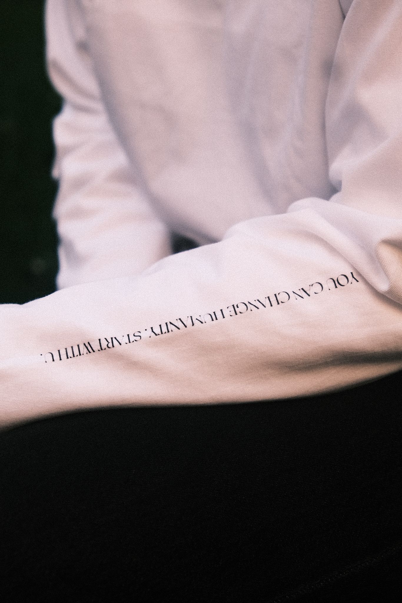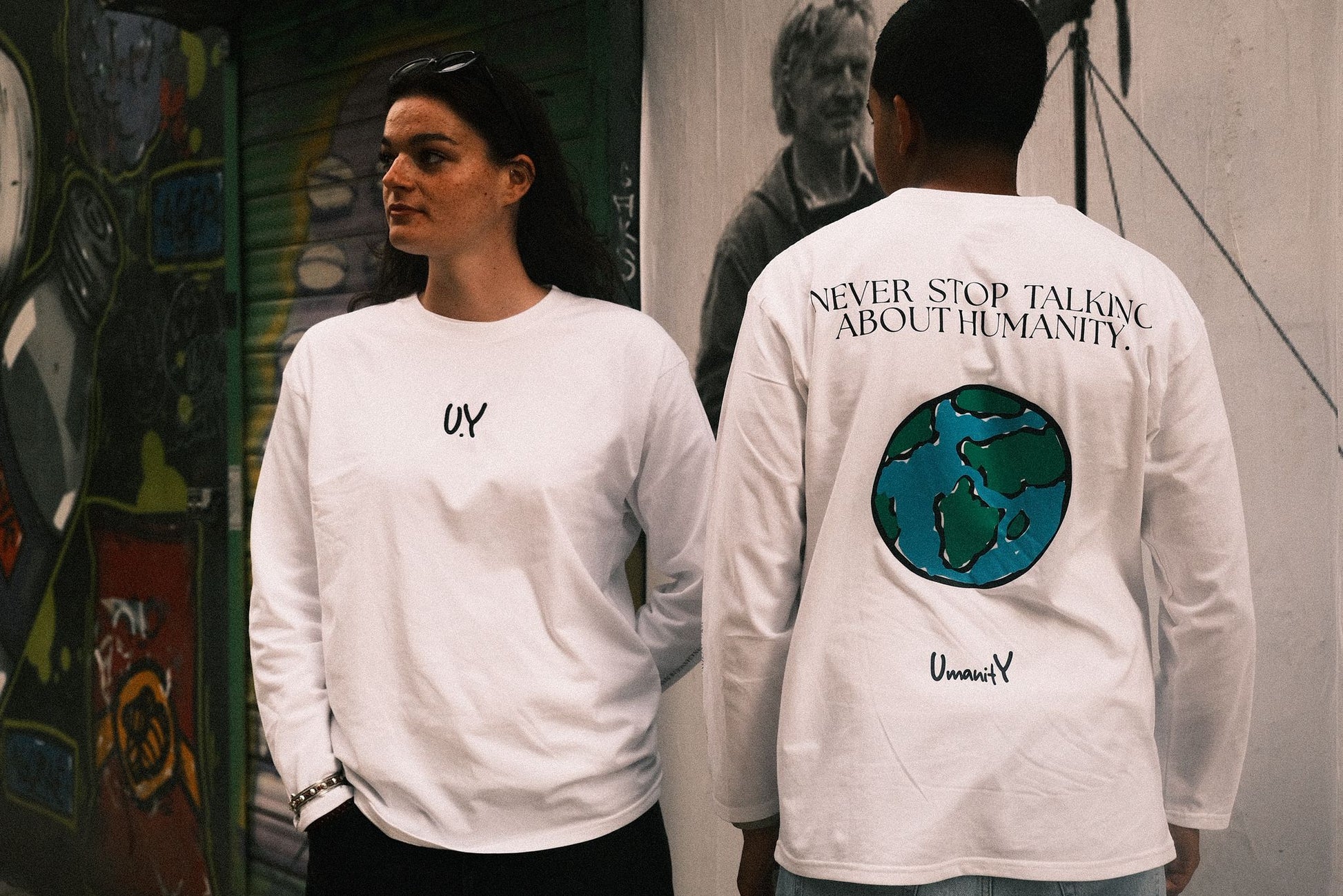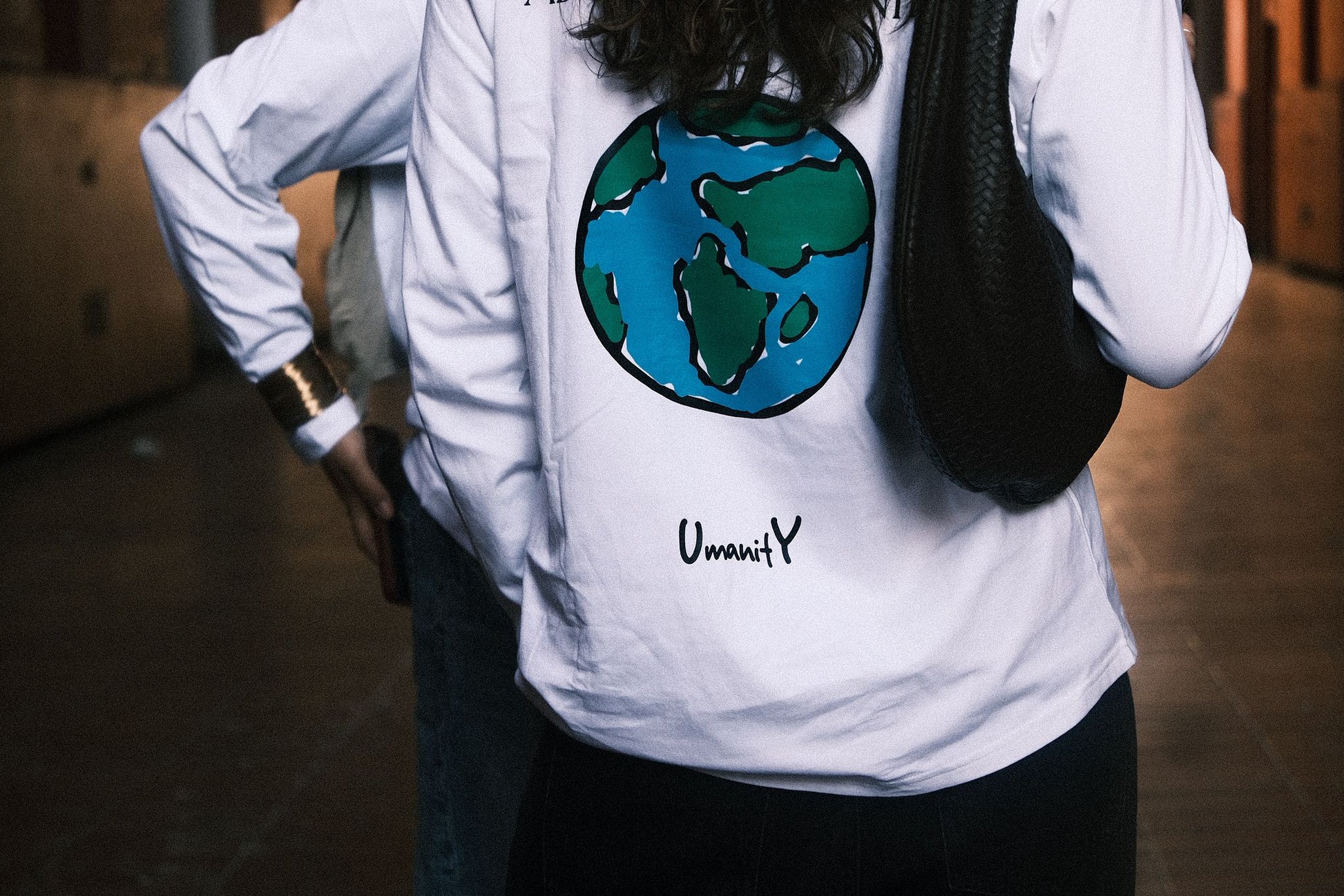 slogan discret dans le dos : “Never stop talking about humanity”, accompagné d’un croquis de la Terre et du rappel de la marque.